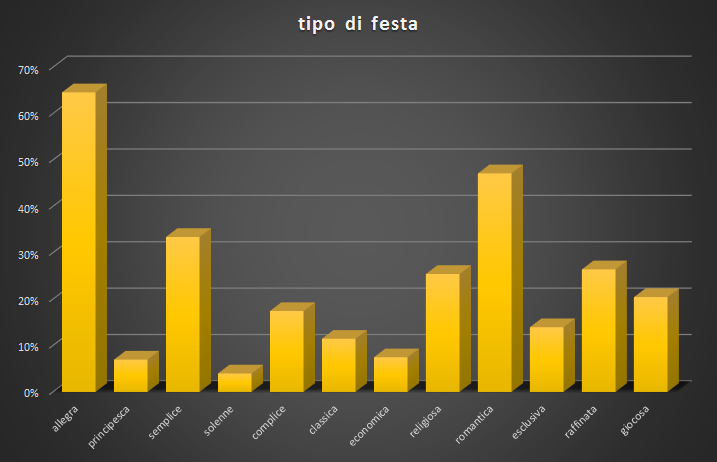 Agli sposi è stato poi chiesto di indicare (possibili risposte multiple, fino a cinque) quali aggettivi descrivessero meglio la tipologia di festa che avrebbero desiderato: