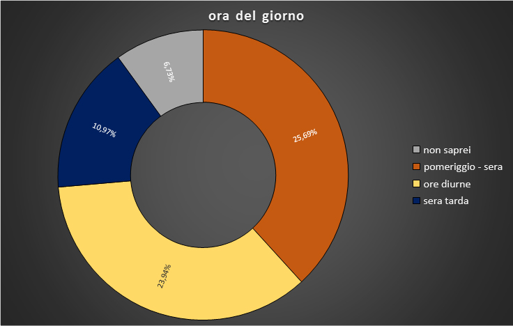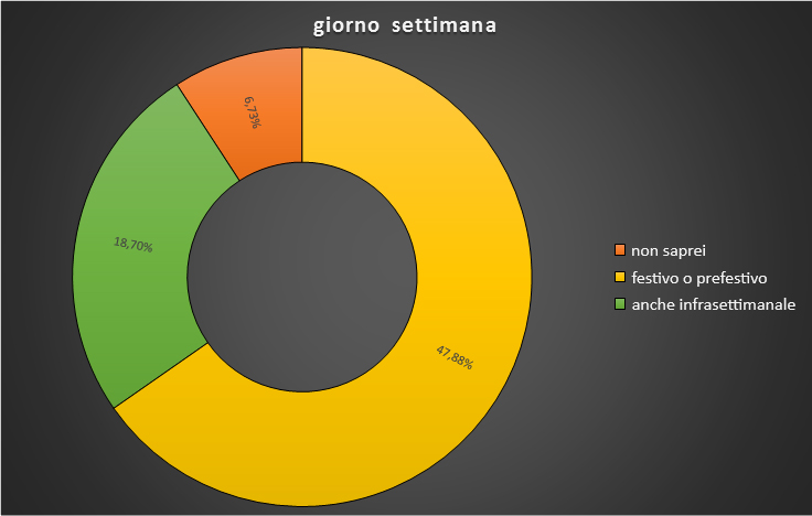 E' interessante notare che - al netto delle molte persone che non sanno cosa rispondere e si astengono - una percentuale complessiva non indifferente (36,66%) festeggerebbe volentieri anche nel tardo pomeriggio o in serata (anche tarda, per quasi l'11%).