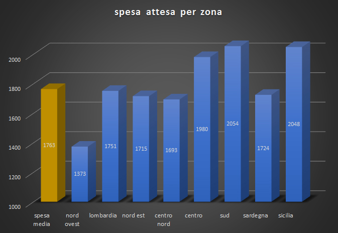 Superano la media di 2.000 euro di spesa attesa le zone del Sud (Campania, Puglia, Calabria, Basilicata), con 2.054 euro di media e quella della Sicilia, con una media di 2.048 euro.